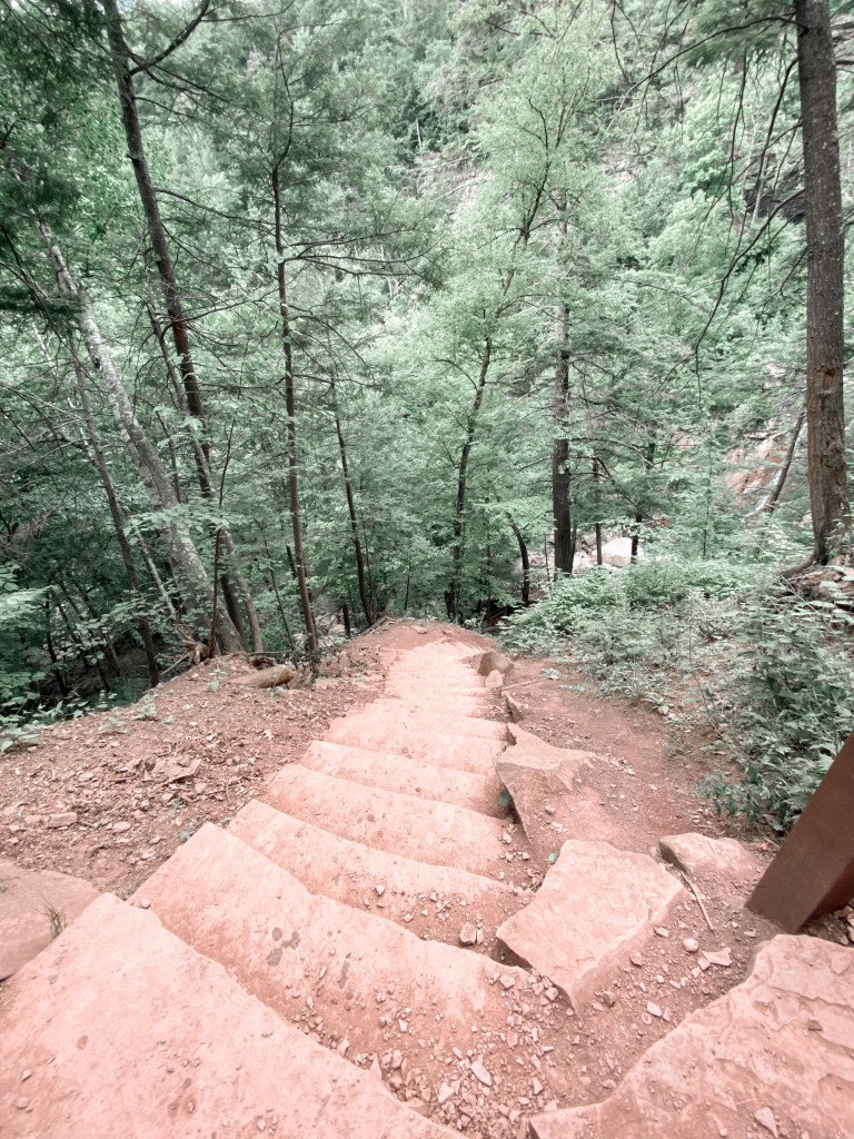 After your downhill hike through the scenic woods, you’ll reach another intersection in the trail. You’ll want to head down the steps to take you to the base of the falls. Heading straight will take you to the middle level. I definitely suggest saving the best (middle level) for last.