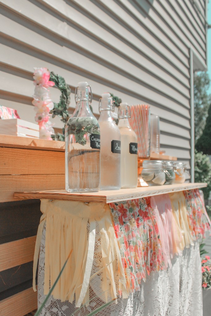 For the bar, I searched for free pallets, also on Facebook Marketplace. These pallets are easy to come by. Tons of business are always throwing them away after a delivery. You can get creative with however you want to build your own bar. That’s the fun part about it! I chose to leave mine unstained and just drape a lace tablecloth across the front. My mom had a lot laying around, so it literally cost me nothing! Only things I bought were the fringe decor that I stapled across the front and some twinkle lights I put in between the pallets.