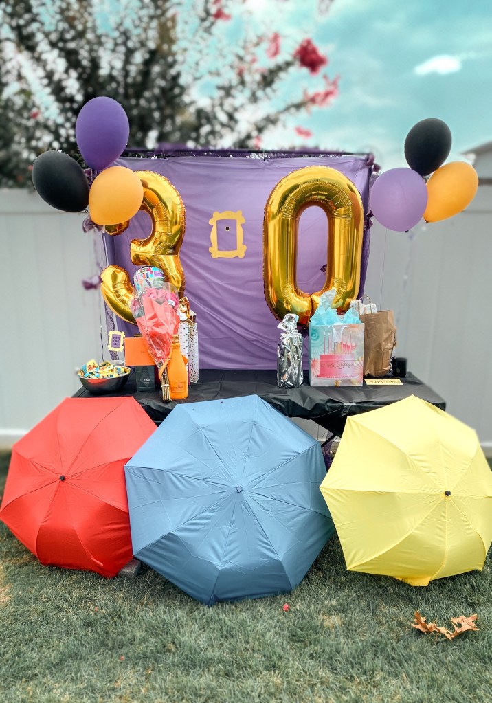 - The purple door with gold frame – You can use purple wrapping paper to cover your door and cut out a paper gold frame and tape on with the peep hole. I choose to use a purple table cloth as a backdrop and put a paper frame on it with ‘30’ balloons.