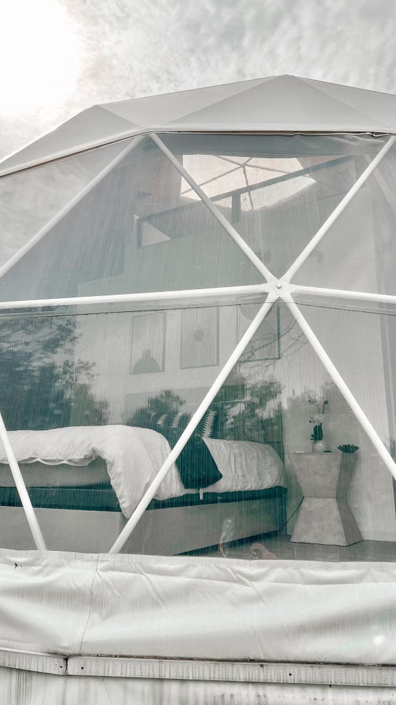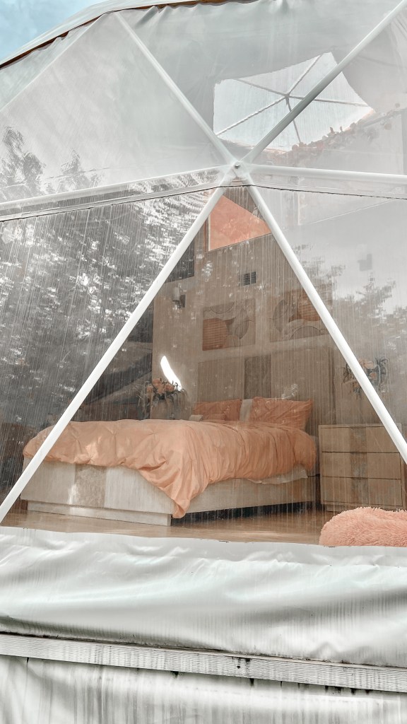 Unique Escapes has four different domes designed with their own theme and personality. We stayed in the “Nature Lovers” dome, with the perfect blend of cozy luxury decor. I really loved how spacious and equipped the dome was. There’s a reading nook tucked under a beautiful faux tree, living room, big comfortable bed, spacious kitchenette and bathroom.